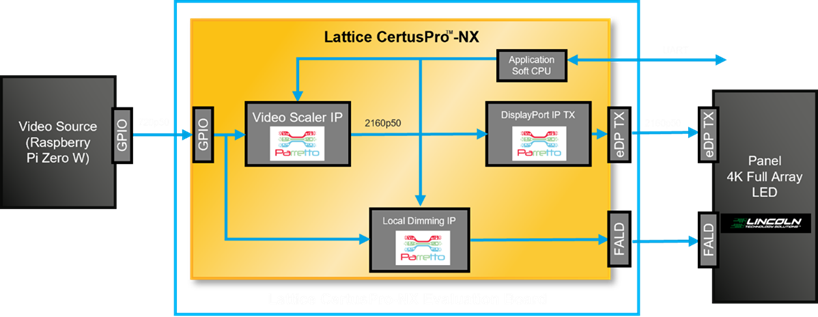 莱迪思构建的演示清楚地展示了局部调光的工作原理。它围绕Raspberry Pi开发板,通过GPIO将720p 50Hz视频流式传输到莱迪思CertusPro-NX FPGA。内部视频缩放器获取该视频数据,并将其放大到 2160p(50 Hz)。同时,局部调光功能可动态控制面板的全 LED 阵列背光。然后DisplayPort发送器IP获取放大后的视频,并以HBR2(4通道)格式将其流式传输到4K像素面板。最后,面板显示该视频,同时全LED阵列背光处于持续控制之中。